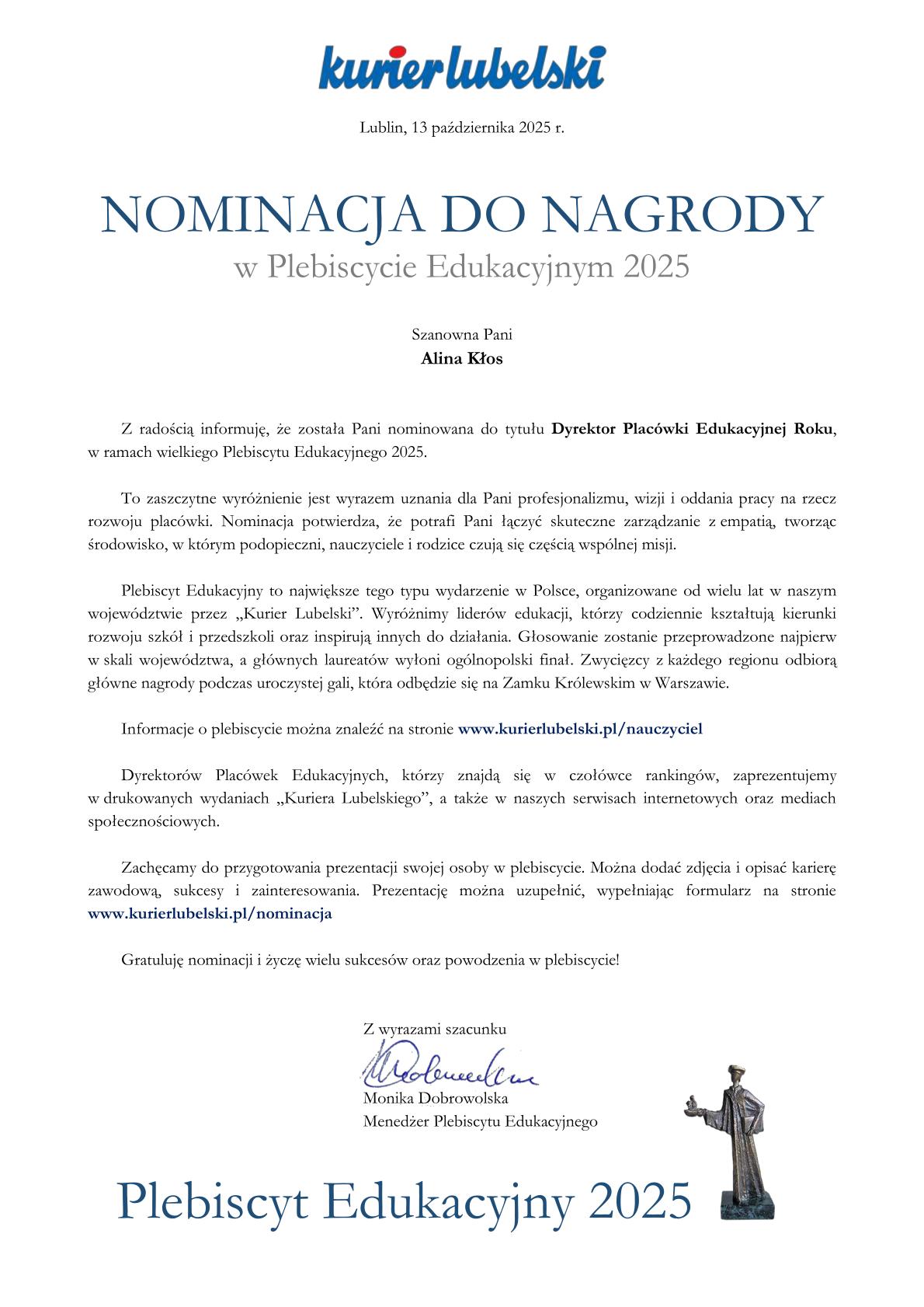 Jednocześnie nominację do nagrody w Plebiscycie otrzymała Pani dyrektor Alina Kłos.