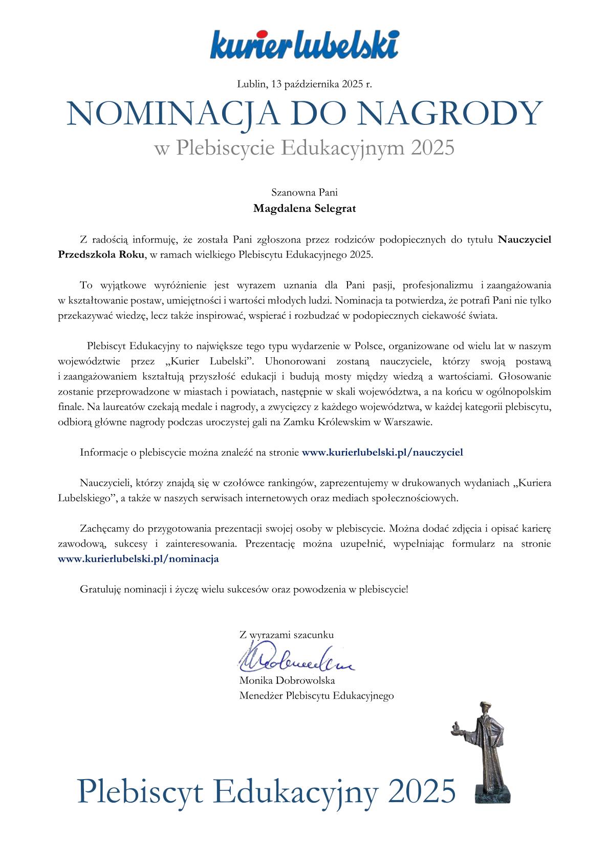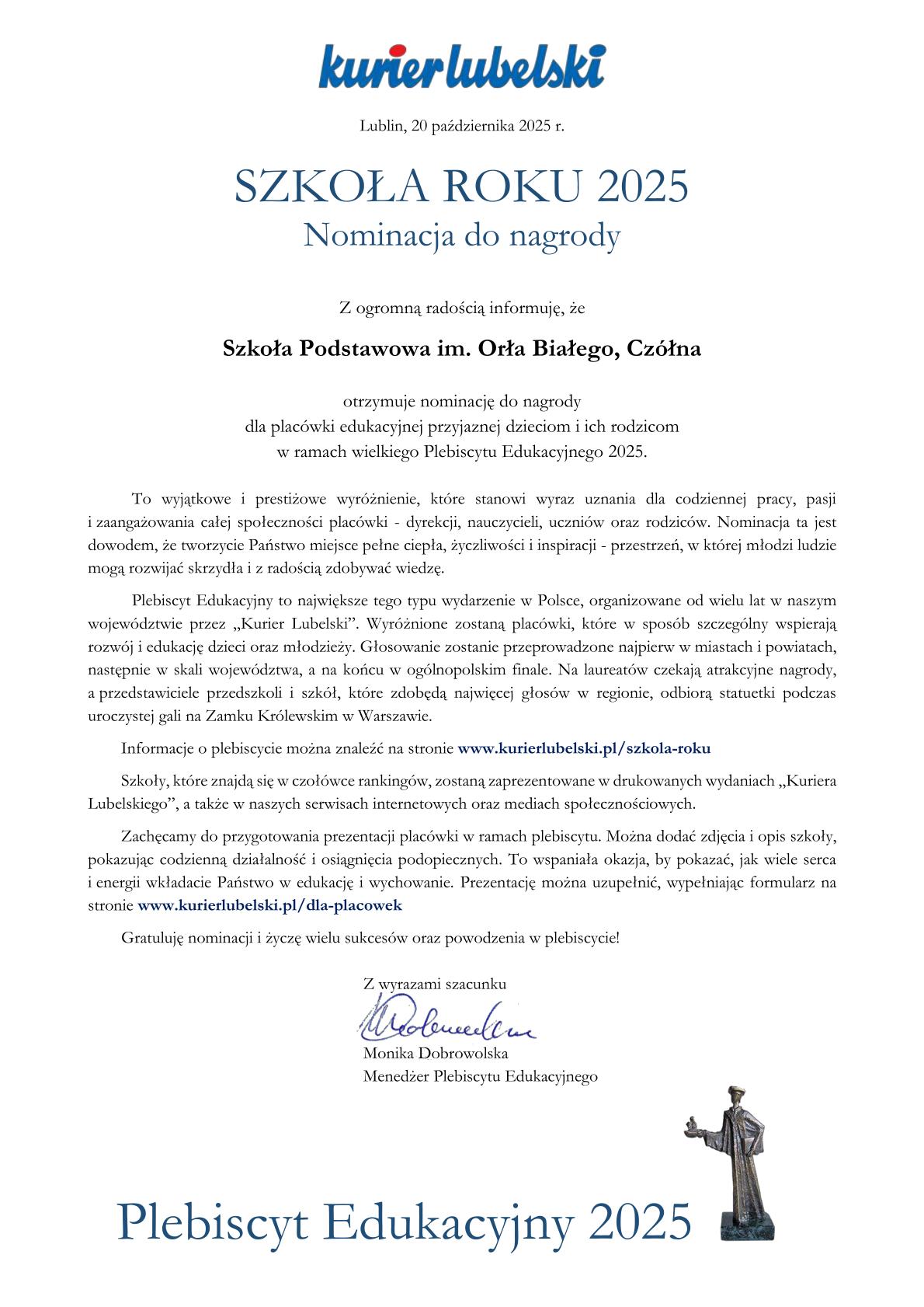 Redakcja „Kuriera Lubelskiego” poinformowała nas, że nasza szkoła została zgłoszona do nagrody w kategorii Szkoła Roku w tegorocznej edycji Plebiscytu Edukacyjnego 2025.