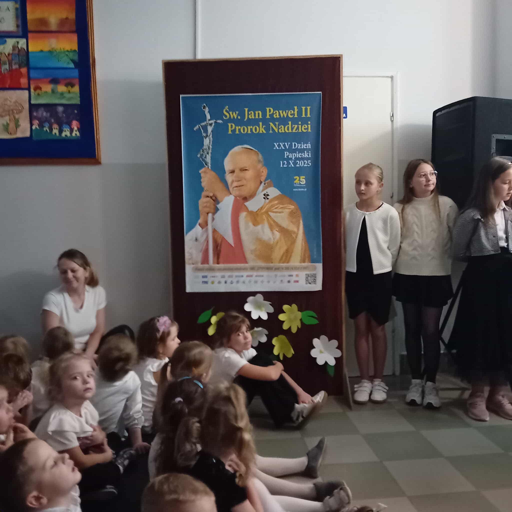 Uczniowie klasy VIII przygotowali montaż słowno- muzyczny z okazji XXV DNIA PAPIESKIEGO . Ten dzień w tym roku był obchodzony pod hasłem: ŚWIĘTY JAN PAWEŁ II – PROROK NADZIEI.